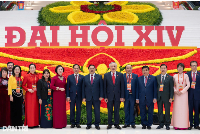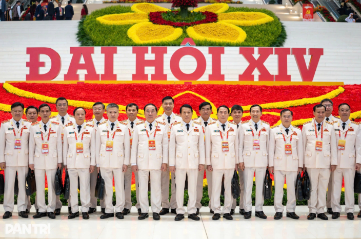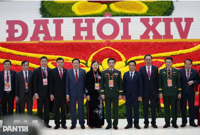 Trưởng Ban Nội chính Trung ương Phan Đình Trạc, Đại tướng Phan Văn Giang, Bộ trưởng Quốc phòng, chụp ảnh cùng các đại biểu tham dự Đại hội XIV của Đảng.