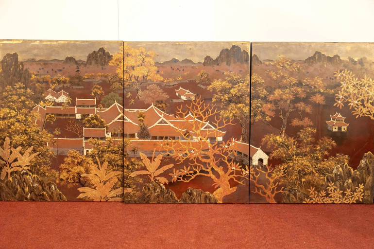 Tác phẩm Chùa Thầy (sơn mài, 180x80cm, ba tấm ghép) của Trần Phúc Duyên. (Ảnh: Quốc Thanh)