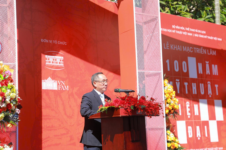 Phát biểu tại triển lãm, Thứ trưởng Văn hóa, Thể thao và Du lịch Tạ Quang Đông chia sẻ: "Trong suốt 100 năm qua, nhà trường đã kế thừa, phát huy tinh hoa của thế hệ đi trước, đồng thời, gắn bó mật thiết với từng chặng đường lịch sử cách mạng của dân tộc. Từ kháng chiến gian khổ đến thời kỳ đổi mới, hội nhập quốc tế, thế hệ thầy và trò nhà trường luôn nỗ lực sáng tạo, đóng góp tích cực trên mặt trận văn hóa-nghệ thuật của nhà nước".