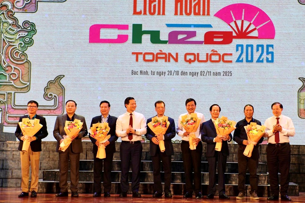 Cục trưởng Cục Nghệ thuật biểu diễn, NSND Nguyễn Xuân Bắc và Giám đốc Sở VHTTDL Bắc Ninh Bùi Thị Thu Thuỷ tặng hoa cho các đơn vị nghệ thuật tham gia Liên hoan