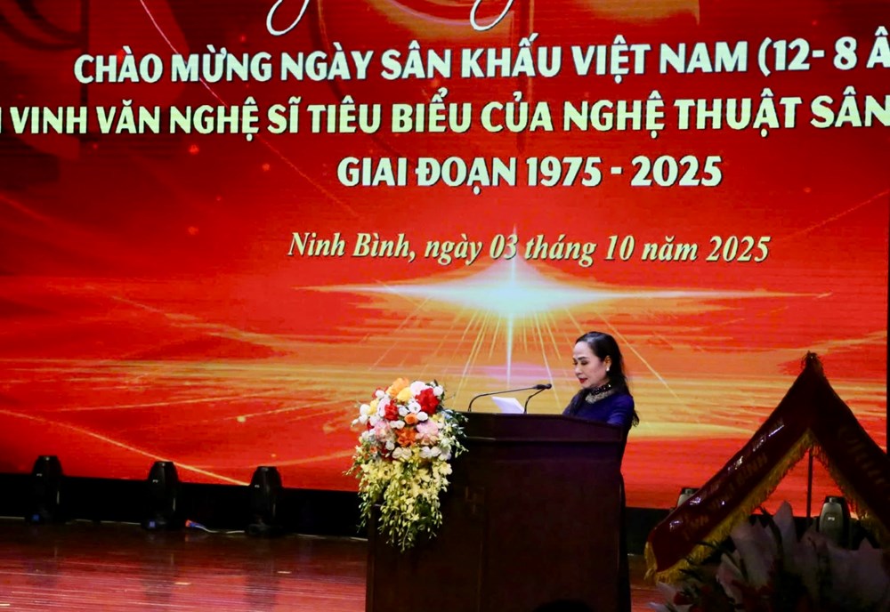 Tối 3.10, tại Nhà hát Phạm Thị Trân, tỉnh Ninh Bình, Hội Nghệ sĩ Sân khấu Việt Nam phối hợp với UBND tỉnh Ninh Bình tổ chức Chương trình nghệ thuật đặc biệt chào mừng Ngày Sân khấu Việt Nam và tôn vinh văn nghệ sĩ tiêu biểu của nghệ thuật sân khấu giai đoạn 1975-2025.