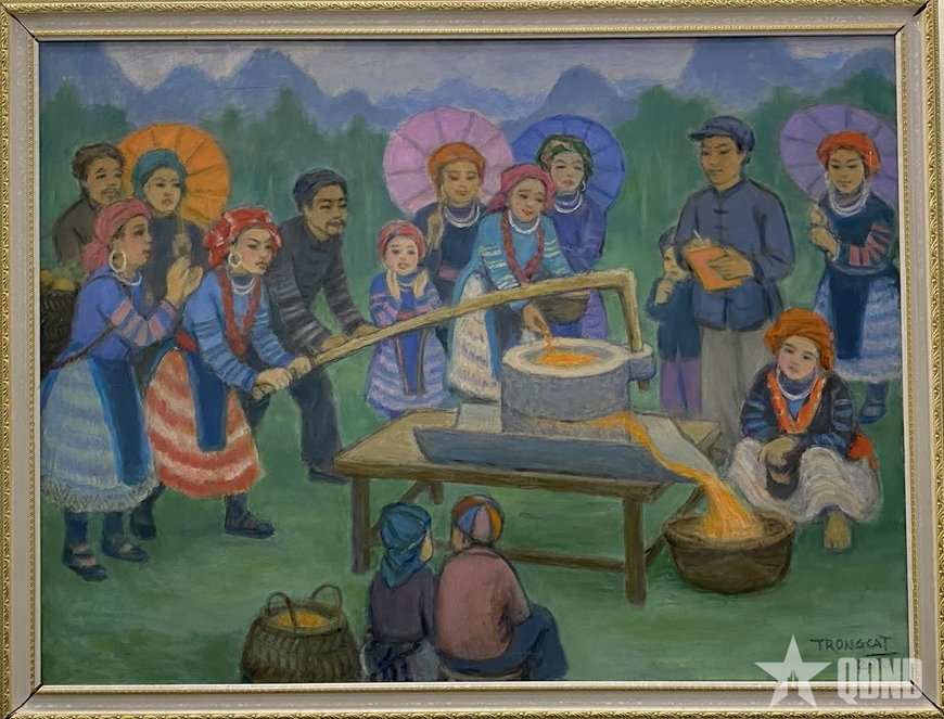 Một mảnh ghép khác của đời sống văn hóa vùng cao được thể hiện qua bức tranh Hội thi xay ngô ở Hà Giang, tranh sơn dầu của họa sĩ Nguyễn Trọng Cát. Tác phẩm tái hiện sinh động không khí ngày hội văn hóa của đồng bào dân tộc Mông, gắn liền với hoạt động lao động sản xuất quen thuộc. Hội thi xay ngô không chỉ mang ý nghĩa vui chơi mà còn thể hiện tinh thần đoàn kết cộng đồng, sự gắn bó giữa con người với mùa màng, đất đai và niềm tự hào về bản sắc văn hóa dân tộc. Ngày hội được tổ chức với mong muốn quảng bá, giới thiệu những nét văn hóa truyền thống, phong tục tập quán của đồng bào địa phương đến du khách trong và ngoài nước, góp phần bảo tồn và phát huy giá trị văn hóa gắn với phát triển du lịch vùng cao nguyên đá Đồng Văn.