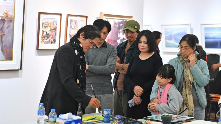 Các nghệ sĩ thực hành tranh màu nước ngay tại triển lãm.