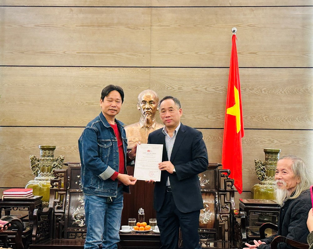 Giám đốc Bảo tàng Mỹ thuật Việt Nam Nguyễn Anh Minh trao giấy chứng nhận cho Nghệ nhân ưu tú Trần Nam Tước