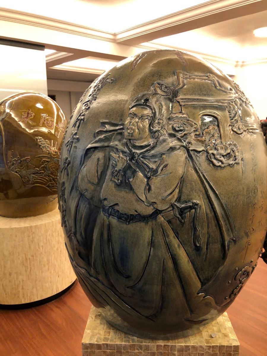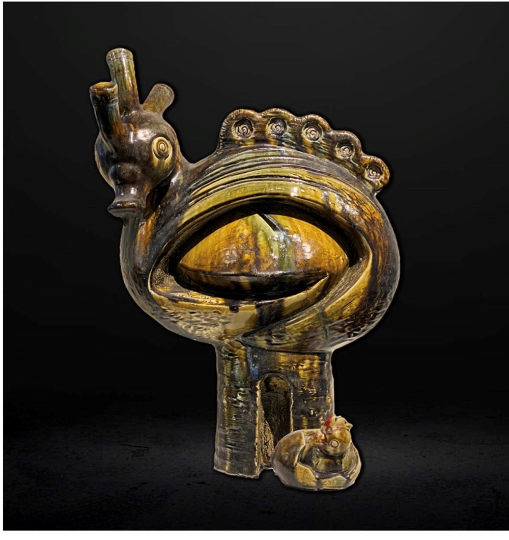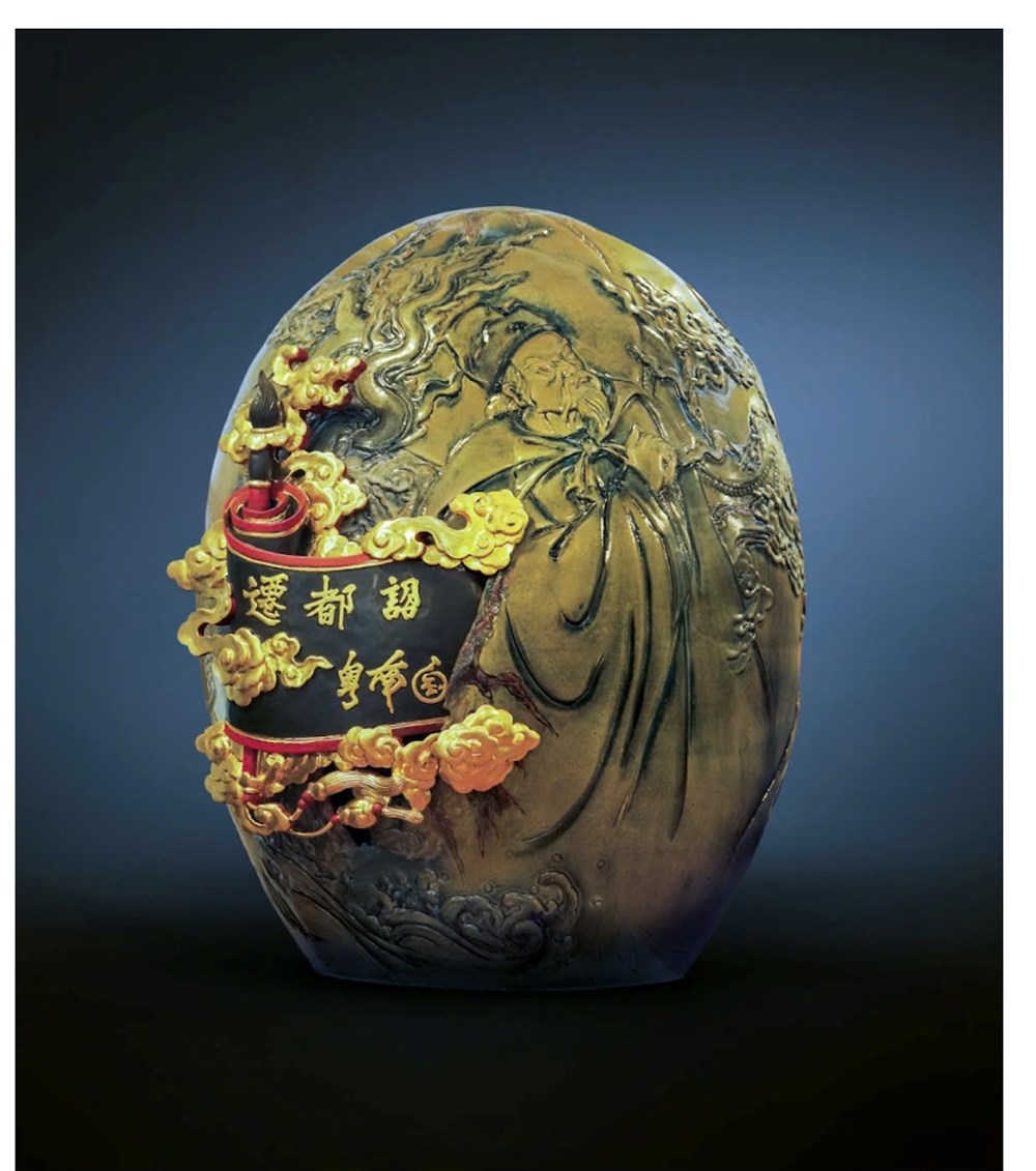 Tác phẩm Trứng nở (110 x 60 cm), chất liệu men đồng hun kết hợp gốm Bát Tràng, sáng tác năm 2024.