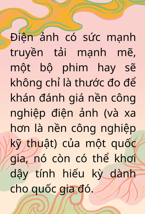 Đúng vậy, điện ảnh có sức mạnh truyền tải mạnh mẽ, một bộ phim hay sẽ không chỉ là thước đo để khán đánh giá nền công nghiệp điện ảnh (và xa hơn là nền công nghiệp kỹ thuật) của một quốc gia, nó còn có thể khơi dậy tính hiếu kỳ dành cho quốc gia đó. Điện ảnh không chỉ tạo cảm xúc tức thời dành cho số phận của những nhân vật trên màn ảnh mà còn khơi dậy sự tò mò về một nền văn hóa khác với cuộc sống thường nhật của khán giả.