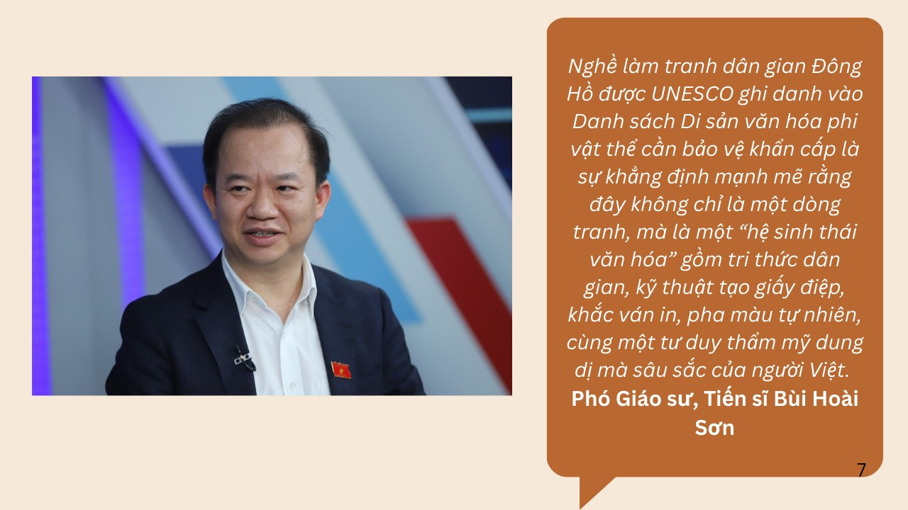 Là người luôn tâm huyết với văn hóa dân tộc, Phó Giáo sư, Tiến sĩ Bùi Hoài Sơn, Ủy viên thường trực Ủy ban Văn hóa, Giáo dục của Quốc hội cho rằng, việc nghề làm tranh dân gian Đông Hồ được UNESCO ghi danh vào Danh sách Di sản văn hóa phi vật thể cần bảo vệ khẩn cấp là sự khẳng định mạnh mẽ rằng đây không chỉ là một dòng tranh, mà là một “hệ sinh thái văn hóa” gồm tri thức dân gian, kỹ thuật tạo giấy điệp, khắc ván in, pha màu tự nhiên, cùng một tư duy thẩm mỹ dung dị mà sâu sắc của người Việt. Những bức tranh như “Đám cưới chuột”, “Đánh ghen”, “Hứng dừa”… không chỉ là tác phẩm nghệ thuật, mà còn là kho lưu trữ ký ức văn hóa, là triết lý sống của một cộng đồng, một vùng đất, một nền văn minh lúa nước.