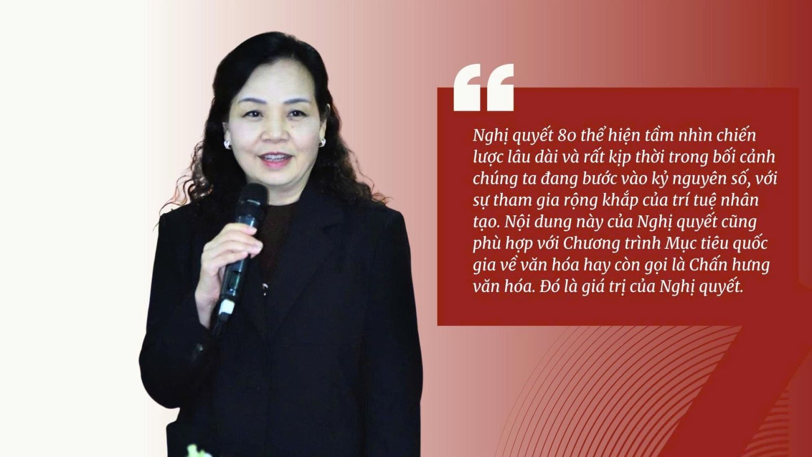 Cùng với sự chủ động, giá trị của bản sắc dân tộc rất quan trọng và ngày càng được đề cao. Nghị quyết 80 thể hiện tầm nhìn chiến lược lâu dài và rất kịp thời trong bối cảnh chúng ta đang bước vào kỷ nguyên số, với sự tham gia rộng khắp của trí tuệ nhân tạo. Nội dung này của Nghị quyết cũng phù hợp với Chương trình Mục tiêu quốc gia về văn hóa hay còn gọi là Chấn hưng văn hóa. Đó là giá trị của Nghị quyết.