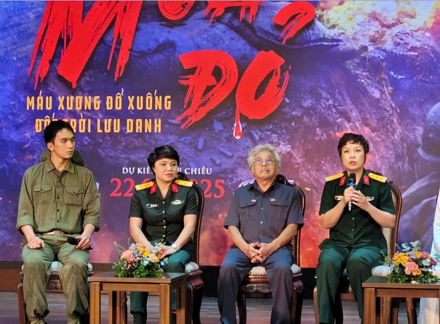 Ê kíp phim "Mưa đỏ" giao lưu với khán giả. Ảnh: NGỌC NAM