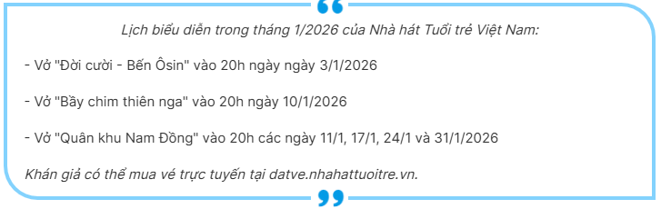 Chính vì vậy, chuỗi vở diễn tháng 1/2026 của Nhà hát Tuổi trẻ có thể xem như một món quà năm mới chất lượng dành cho công chúng yêu nghệ thuật kịch nói. Qua các vở diễn, khán giả có thể cùng nhau trải nghiệm, đồng cảm và được tiếp thêm những giá trị nghệ thuật bền vững.