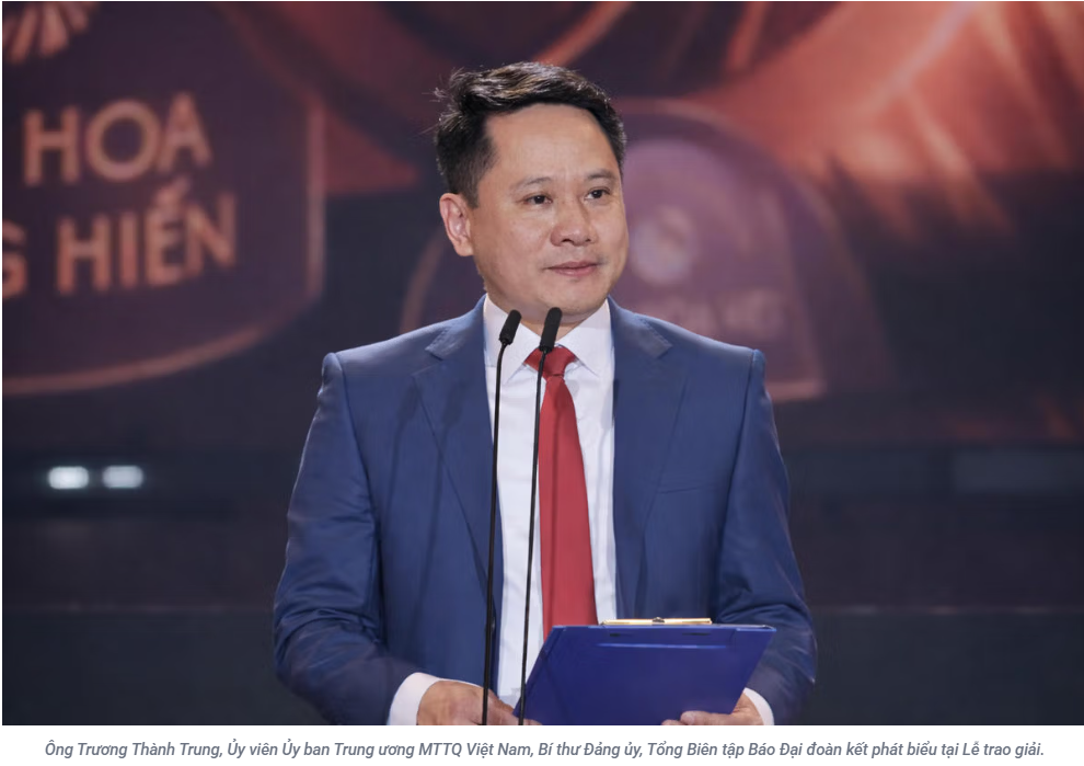 Thay mặt Báo Đại Đoàn Kết, nhà báo Trương Thành Trung bày tỏ sự trân trọng cảm ơn các lãnh đạo, đại biểu, Hội đồng Giám khảo, đội ngũ văn nghệ sĩ, trí thức, các nhà sáng tạo, các đối tác, nhà tài trợ và toàn thể những người đã đồng hành, đóng góp tâm huyết cho giải thưởng Tinh Hoa Việt năm 2025. Nhà báo Trương Thành Trung nhấn mạnh, sự đồng hành này không chỉ góp phần tạo nên thành công của một giải thưởng, mà còn thể hiện niềm tin xã hội đối với những giá trị văn hóa bền vững mà chúng ta đang cùng nhau theo đuổi.