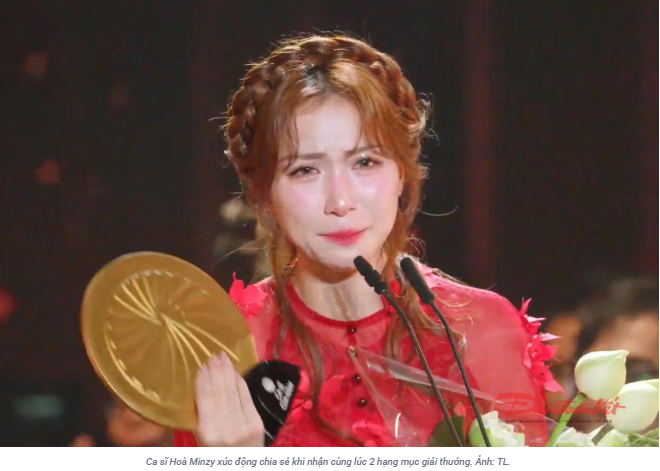 Ca sĩ Hoà Minzy xúc động chia sẻ khi nhận cùng lúc 2 hạng mục giải thưởng. Ảnh: TL.