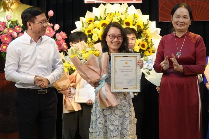 Phó giám đốc Sở Văn hóa và Thể thao TP.HCM Nguyễn Ngọc Hồi (trái) và Chủ tịch Hội Nhà văn TP.HCM Trịnh Bích Ngân trao giải thưởng văn học trẻ cho tác giả Giai Du - Ảnh: LINH ĐOAN