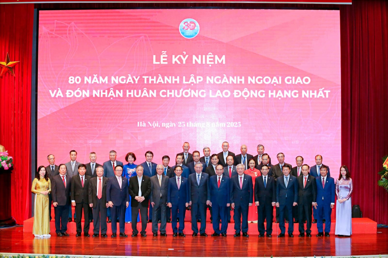 Thủ tướng Chính phủ Phạm Minh Chính chụp ảnh chung cùng các đại biểu tham dự buổi Lễ trao tặng Huân chương Lao động hạng Nhất cho Ủy ban Biên giới quốc gia, Bộ Ngoại giao nhân Lễ kỷ niệm 50 năm thành lập (1975 - 2025), ngày 15/12/2025. Nguồn: Bộ Ngoại giao.